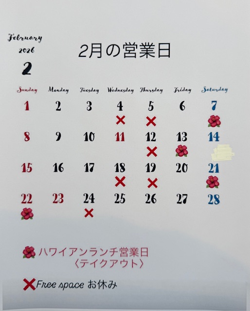 2月<ハワイアンランチ>営業日